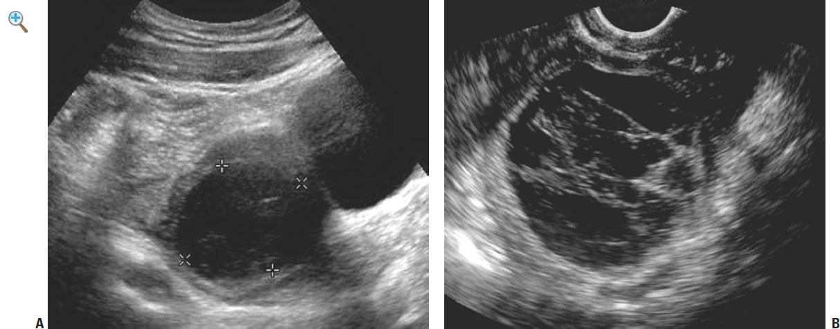 Fig. 1-8 Hemorrhagic ovarian cyst demonstrated with (A) a 35-MHz transducer from a transabdominal approach and (B) a 7.5-MHz transvaginal approach. A nonspecific ovarian cyst is seen on the transabdominal scan The improved resolution on the transvaginal scan demonstrates lacy fibrinous intraluminal membranes typicalofhemorrhagic cysts