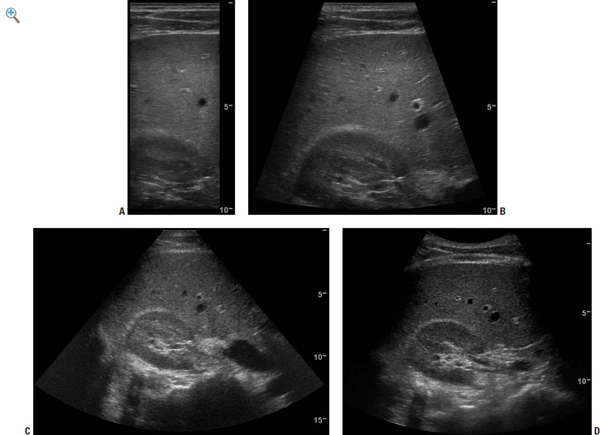 Fig. 1-4 Comparison of standard transducers imaging the liver and kidney. A: Linear array programmed for rectangular imaging In this format, there is excellent resolution throughout the image but a very limited field of view. B: Linear array programmed for sector (trapezoidal) imaging In this format, there is excellent resolution (although slightly less than in the rectangular setting), with a slightly larger field of view. C: Linear array programmed for sector imaging. This format provides the largest field of view with the lowest resolution D: Curved array This provides a compromisewithrelatively highresolutionandarelatively largefieldofview.