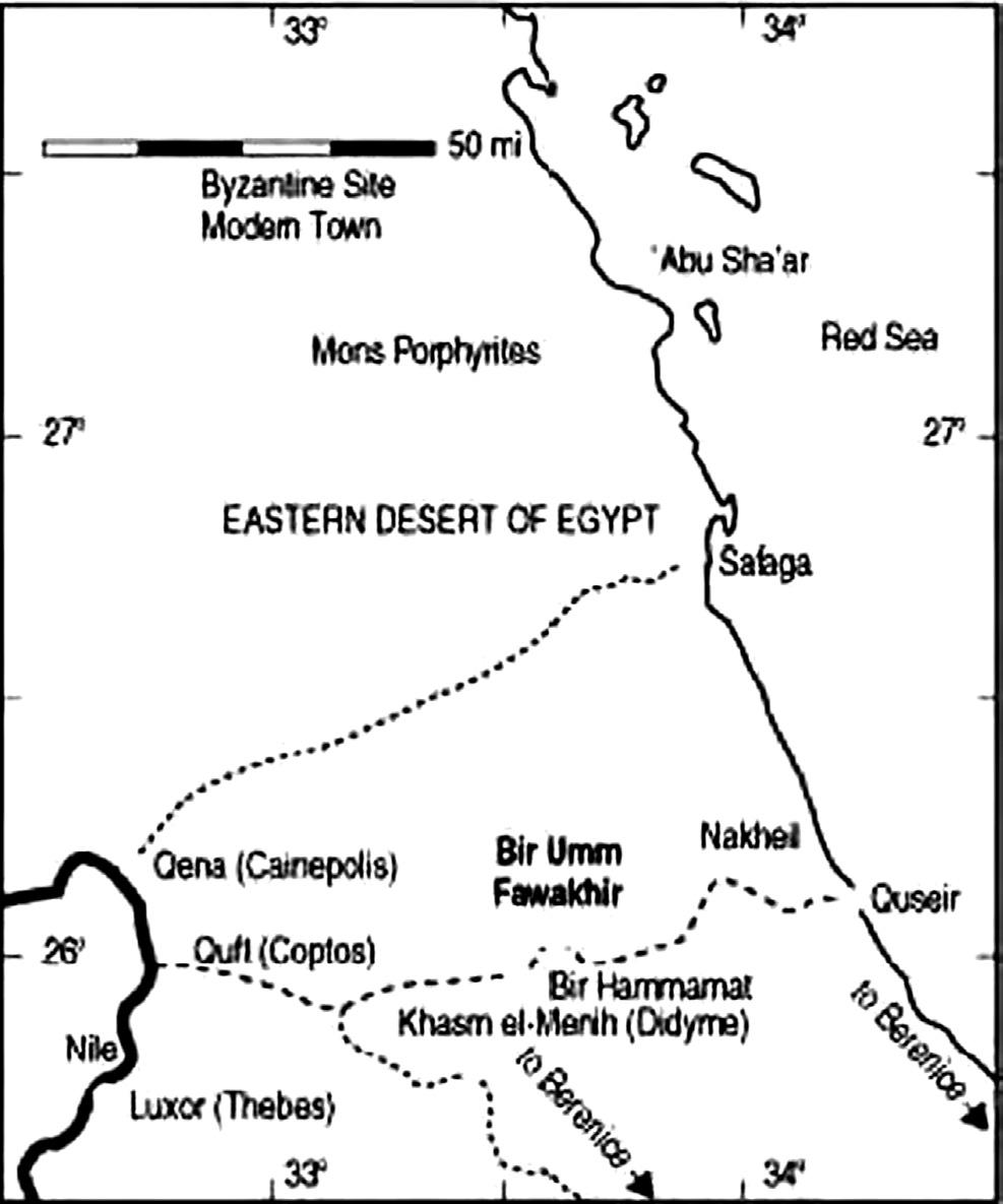 TheancientEgyptiansdidnothaveanimportantportontheMediterraneanandalltheirtradewasthroughtheRedSea. CoptoswasatthestartingpointofthetwogreatroutesleadingtothecoastoftheRedSea,onetowardtheportofTââou (MyosHormos)andtheothermoresoutherly,towardtheportofShashirit(Berenice).Underthepharaohs,thewholetrade ofsouthernEgyptwiththeRedSeapassedoverthesetworoads.UnderthePtolemys,andinRomanandByzantinetimes, merchantsfollowedthesameroadsforpurposesofbarterwiththecoastsofZanzibar,SouthernArabia,India,andtheFar East.Thisplaceandthesurroundingareawereknownfortherichnessofitsgoldminesandsemipreciousstones.Atemple wasbuilttherebyTahutmesIII,whoruledfrom1503to1450BCandwasco-regentwithQueenHatshepsutfor21years. TheareathatitoccupiedwasabouttwiceaslargeashistempleatMadinetHabuinLuxor.