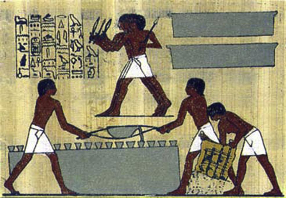 FIGURE1.3 AncientEgyptianwallpaintingdatingfromabout1450BCinthetombofRekhmire,viziertoThothmesIIIatThebes,showingmetal workerscastingmoltengoldinthemolds.