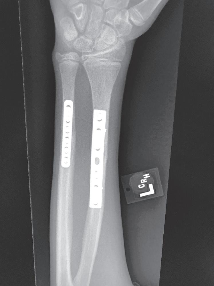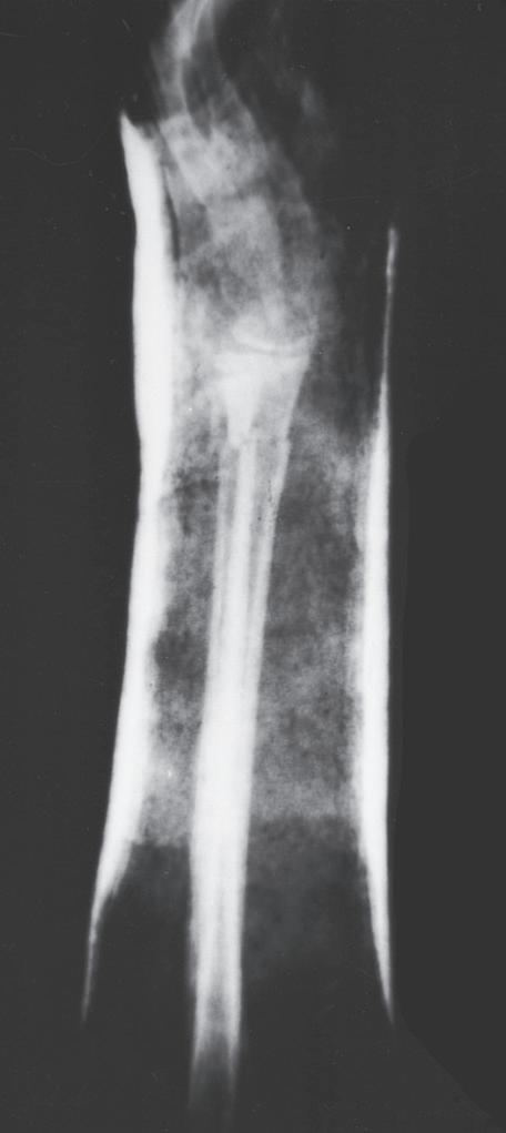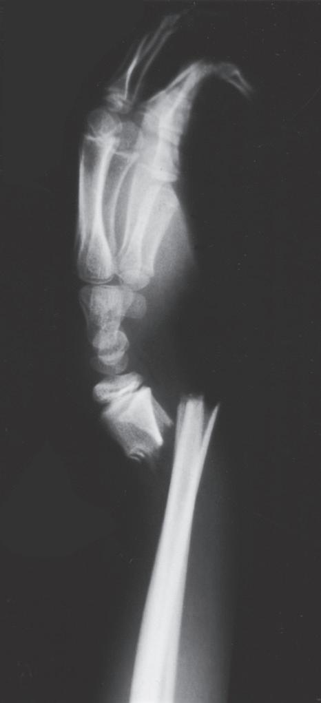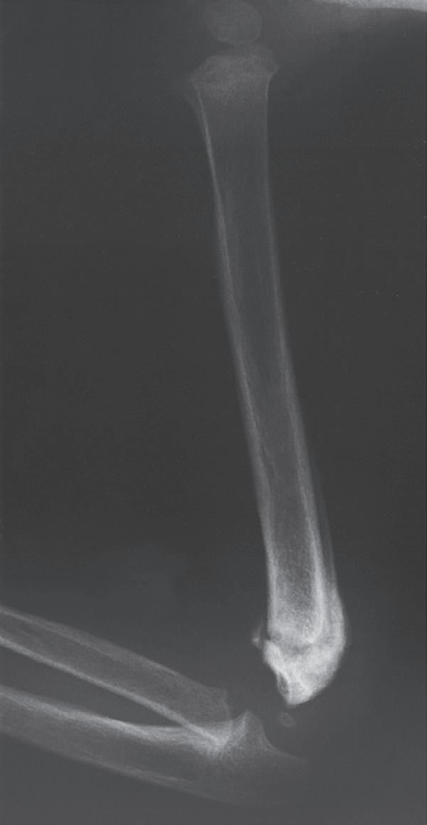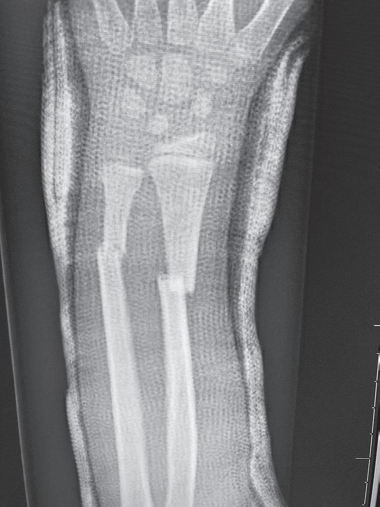 Fig. 1.11 Plastic deformation in the radius and ulna of a 2-year-old patient after a fall. The bones are plastically deformed at the midshaft, with volar compression and dorsal tension failure, but without fracture propagation.