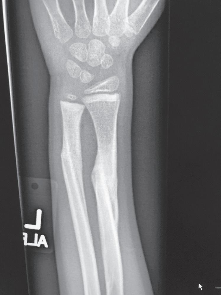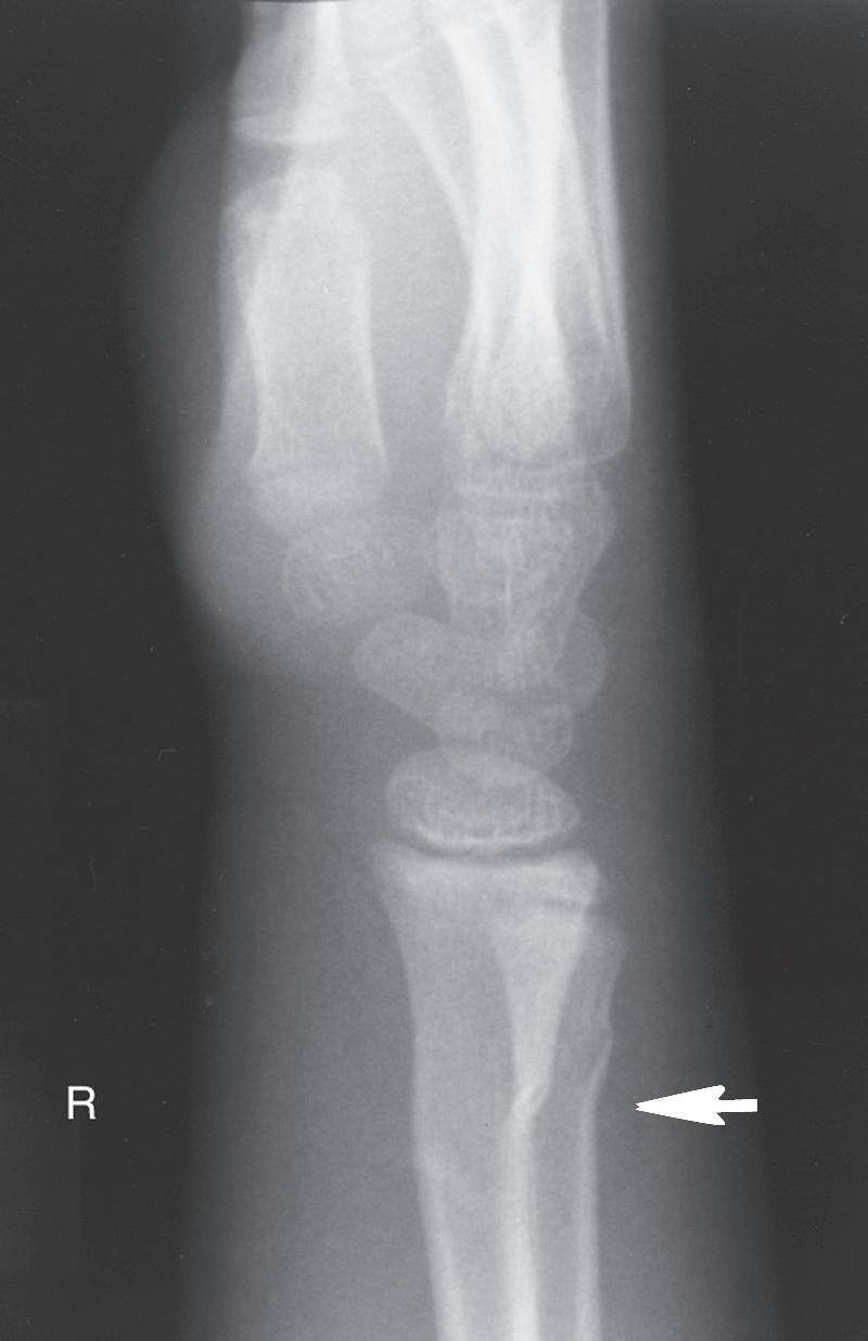Plastic deformation of bone is essentially unique to children. It is most commonly seen in the ulna and, occasionally, the fibula. If no hematoma is formed, periosteal elevation and significant callus formation may not occur to promote remodeling, and the bone may be permanently deformed. If the deformity occurs in a child younger than 4 years or if the deformation is less than 20 degrees, the angulation usually corrects with growth.1 Plastic deformation that produces clinically evident deformity should usually be reduced because remodeling can be unreliable.