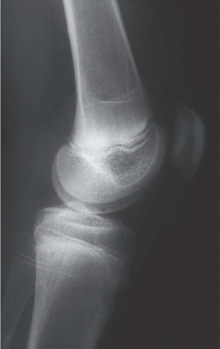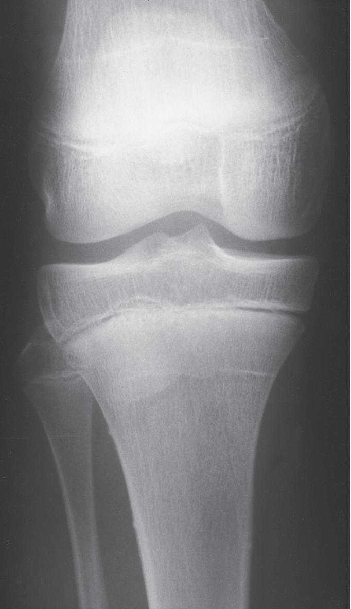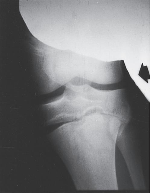 As the skeleton of a child grows, it develops from a relatively elastic and rubbery type of biomechanical material to the more rigid structure of an adult skeleton. Because of the amount of radiolucent cartilaginous material in pediatric bone, comparison films are sometimes necessary to determine whether a radiograph is abnormal, and this lack of clarity in the radiograph can make diagnosis of fractures difficult. The types of injuries may also be different in children; for example, ligamentous injuries and dislocations are rare. Injuries around the knee frequently lead to ligamentous and meniscal injuries in adults. In children, the distal femoral or proximal tibial physis is more likely to be injured because it is the weak link (Fig. 1.7). Previously, stress radiographs were recommended, but these are usually unnecessary because the diagnosis can be made by a complete history and physical examination and confirmed at follow-up when radiographs demonstrate a widened physis consistent with a healing growth plate injury. Ligamentous injuries in skeletally immature children are uncommon, but they do occur and become more frequent in adolescence as