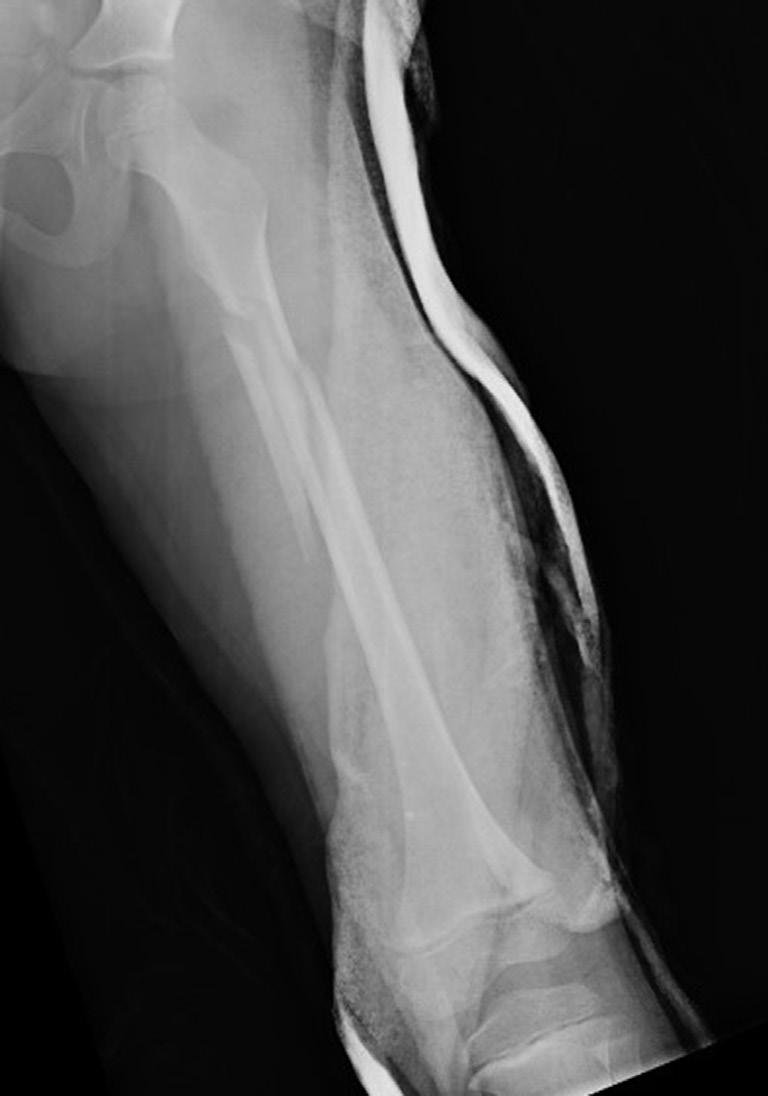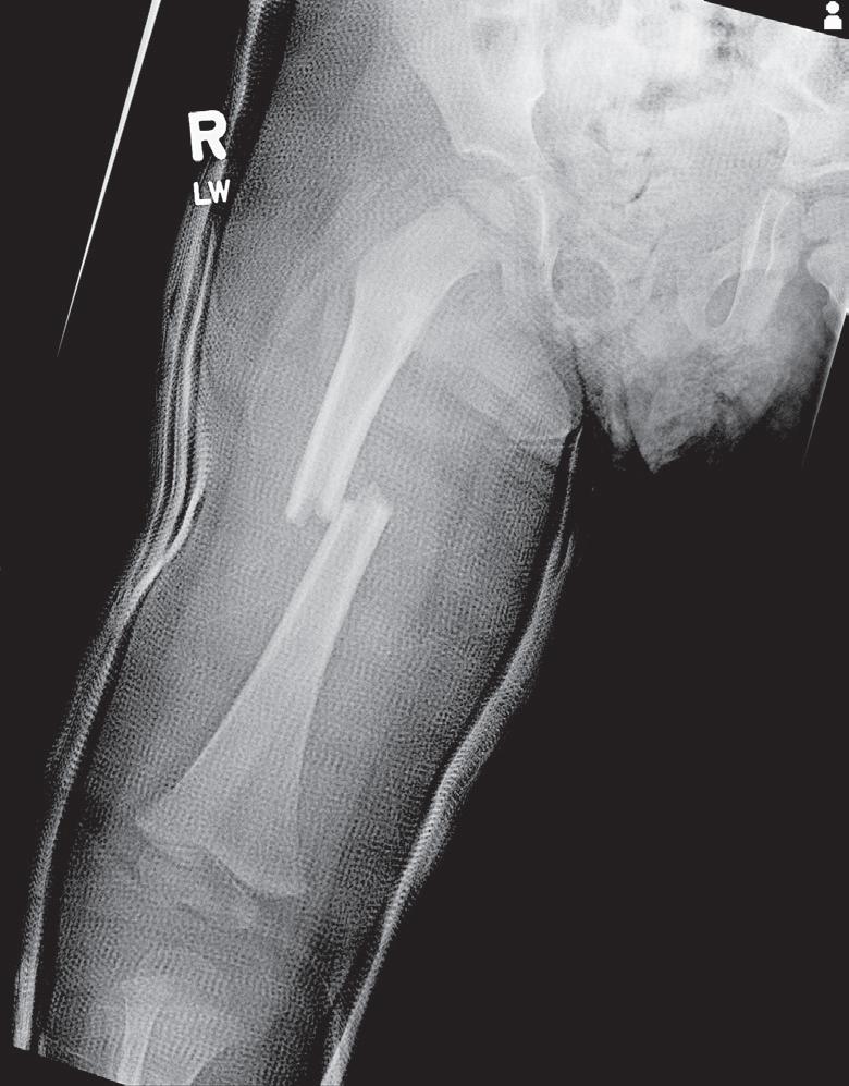 Fig. 1.14 Radiograph of the femur in a 7-year-old patient involved in a motor vehicle collision. The butterfly fragment typically lies on the side of the apical force of the three-point bend.