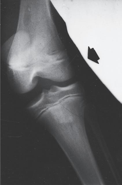 Fig. 1.3 Anteroposterior (A) and lateral (B) radiographs of the knee of a 12-year-old child 6 months after a femoral shaft fracture. Arrest lines parallel to the physis can be seen in the metaphyseal area of the distal end of the femur and proximal tibia (arrows). The temporary depression of growth at the time of injury results in more horizontal trabeculae being laid down, thereby increasing the density of bone at that level.