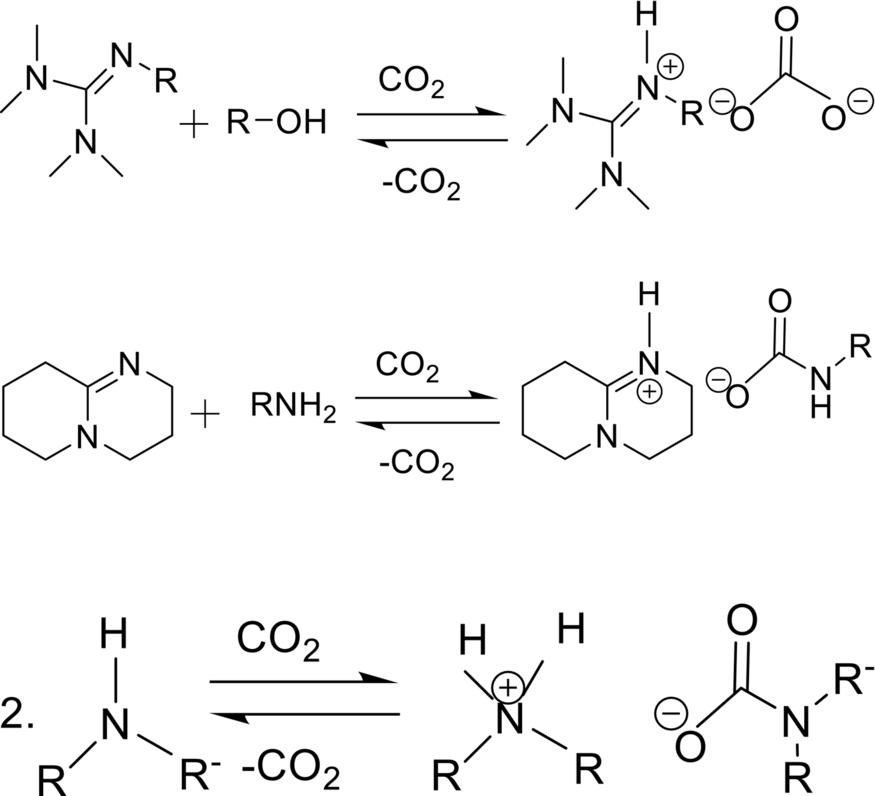 The molecular liquids often have equimolar mixtures of amines and alcohols as a nucleophilic solvents and guanidines, amines, or amidines, as an organic base [44, 45]. When CO2 binds to the nucleophilic moieties, it chemically results in the formation of ammonium carbonate and carbamate salts. In some cases, same molecule act as a nucleophile and a base in one-component switchable solvent system. In some cases, same molecule act as a nucleophile and a base in one-component switchable solvent system [46, 47] as shown in Fig. 3.