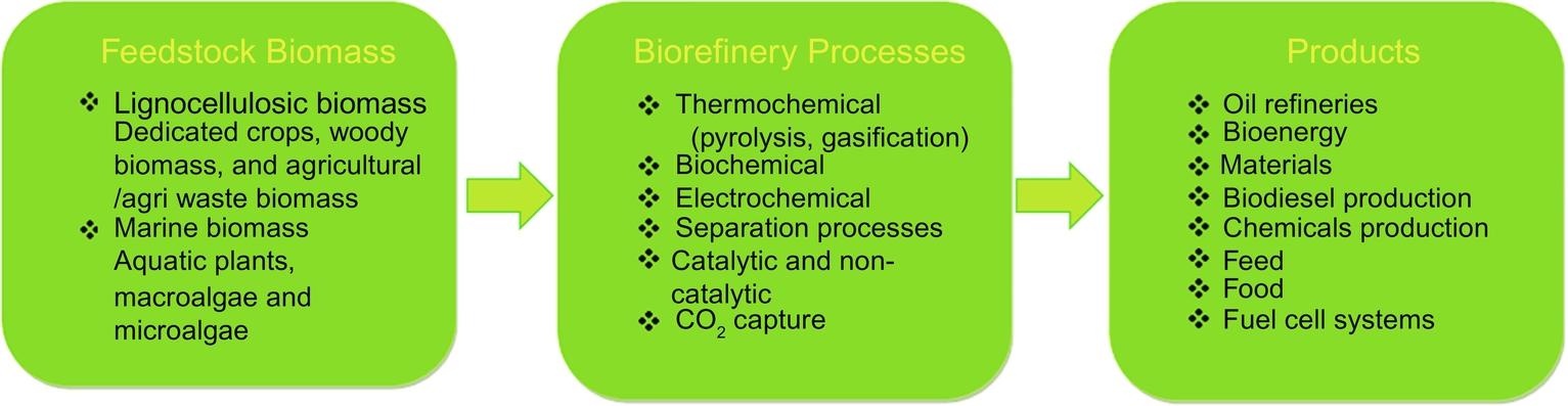 Biorefinery is basically a conversion process of biomass feedstock into commercial products such as fuels, chemicals, and materials similar to petroleum resources [32]. In biorefinery processes, proper utilization of feedstock is essential to produce low-cost products while maintaining the concept of sustainable economy [33]. Biomass has the inherent property of diverse and complex molecular structures that makes them ideal candidates to transform into different chemicals and materials with excellent properties.