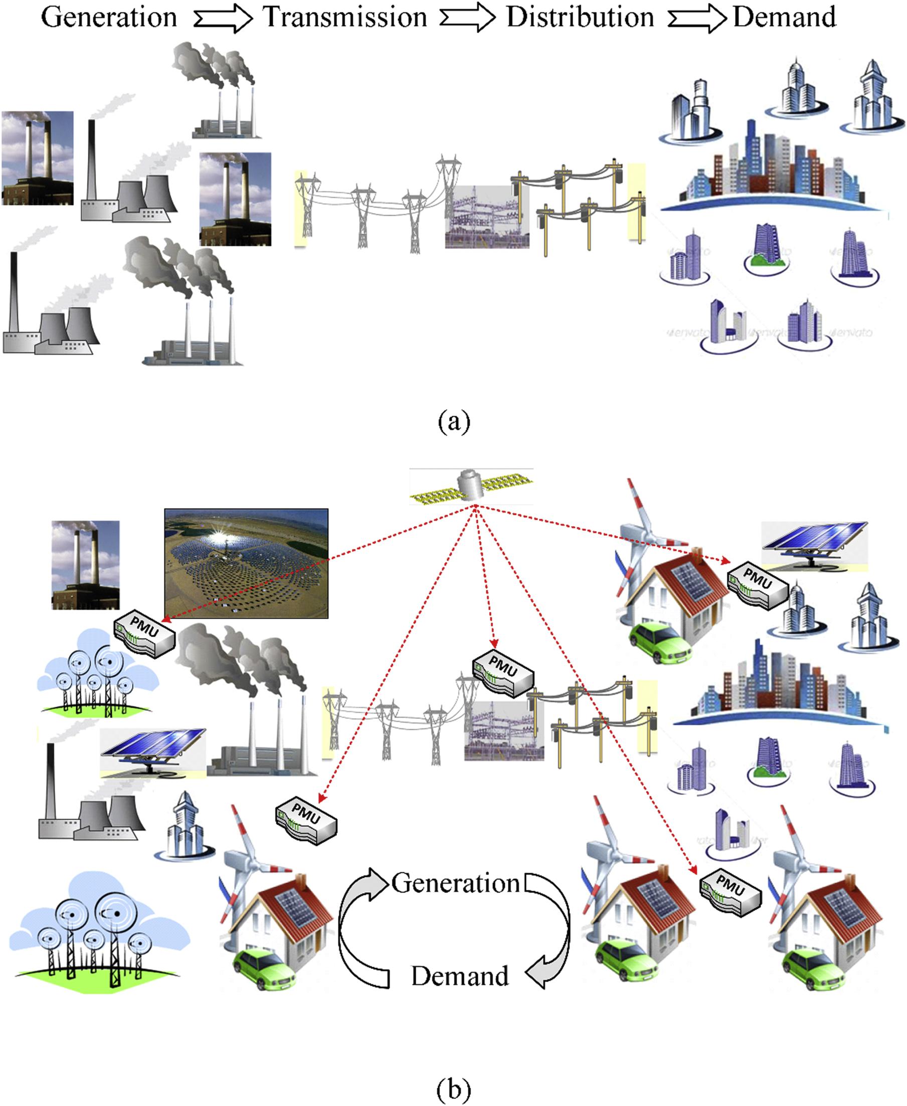 FIGURE 1.1 (A) Conventional power grid, (B) Modern power grid.