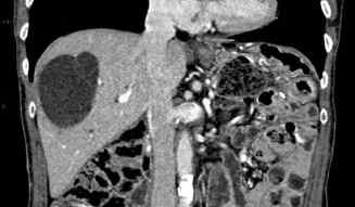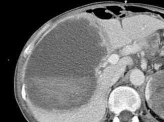 Le niveau liquide-liquide peut être reconnu sans ou après injection de produit de contraste. On visualise un interligne horizontal séparant deux composants de densités différentes au sein d’une lésion hépatique. On doit chercher d’autres lésions hépatiques et évaluer leurs caractéristiques. Il faut principalement chercher des lésions d’âges différents. Au sein de chaque lésion, il faut chercher une hétérogénéité lésionnelle, un rehaussement hépatique périphérique. S’il existe des lésions pseudokystiques, il faut chercher un épaississement pariétal, des nodules intramuraux.