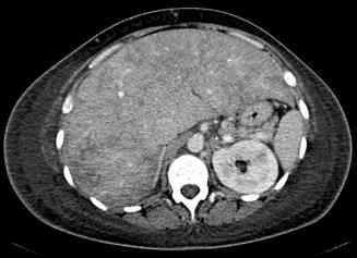 L’hépatomégalie peut être visualisée avant ou après injection. Il existe des normes de dimensions normales du foie. En pratique, elles sont difficiles à utiliser, car elles dépendent largement des caractéristiques de l’orientation du foie dans l’abdomen et du morphotype du foie. Le meilleur signe est sûrement l’aspect arrondi des angles du foie. Sur les coupes sagittales ou frontales, on peut facilement analyser le bord inférieur du foie, qu’il n’est pas facile d’analyser sur les coupes transversales.