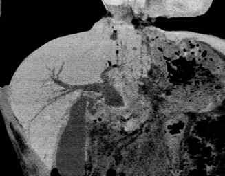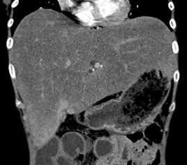 L’hépatomégalie peut être visualisée avant ou après injection. Il existe des normes de dimensions normales du foie. En pratique, elles sont difficiles à utiliser, car elles dépendent largement des caractéristiques de l’orientation du foie dans l’abdomen et du morphotype du foie. Le meilleur signe est sûrement l’aspect arrondi des angles du foie. Sur les coupes sagittales ou frontales, on peut facilement analyser le bord inférieur du foie, qu’il n’est pas facile d’analyser sur les coupes transversales.