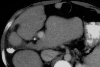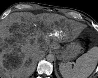 Lésion hépatique calcifiée. Il s’agit, en scanner, d’un signe facile à reconnaître si on a réalisé des coupes sans injection de produit de contraste. Quand elles sont massives, ces calcifications sont également facilement reconnues après injection de produit de contraste. Il peut être plus difficile de reconnaître des calcifications fines sur des coupes réalisées avec injection de produit de contraste ; dans ce cas, il peut être intéressant d’analyser les coupes réalisées à distance de l’injection.