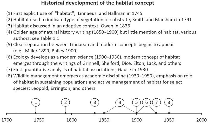 In the scientific literature, use of “habitat” predates “ecology” as the latter was not coined until 1866 by the famous German biologist and philosopher, Ernst Haeckel (Stauffer 1957). The habitat concept developed over a period of at least 200 years (Fig. 1.2). To my knowledge, no one has ever tracked down the first use of the word “habitat.” This would be a difficult task anyway given that the word has shared etymology with other similar words (e.g.,