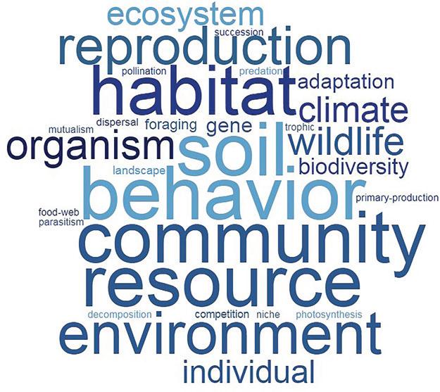 Figure 1.1 Word cloud depicting usage of “habitat” and select other terms in the ecological literature from 1864–2018. Each word was searched in ISI Web of Science along with “ecolog*” so as to eliminate papers that were not ecological. Each term appeared in the title or abstract of the following number of papers (×1,000): species—1,657, population—1,576, behavior—750, soil—749, community—728, resource—726, habitat—695, environment—592, reproduction—536, organism—415, wildlife—392, climate—352, ecosystem—333, individual—322, biodiversity—223, adaptation—210, gene—210, foraging—145, landscape—117, competition—107, dispersal—106, predation—105, photosynthesis—77, trophic—67, parasitism—52, niche—52, succession—52, primary production—51, food web—38, decomposition—38, pollination—27, and mutualism—24.