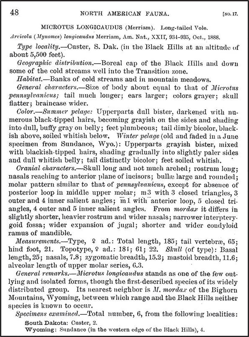 Figure 1.3 Species description for the long-tailed vole (Microtus longicaudus) as presented by Vernon Bailey in Revision of American Voles of the Genus Microtus, North American Fauna Volume 17, 1900. This is the actual page from the monograph. Note that “type locality,” “geographic description,” and “habitat” are separate categories thereby indicating that Bailey explicitly recognized that habitat was more than just the geographic location where a species was found.