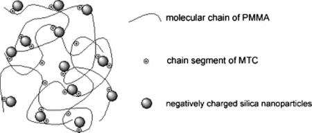 Unmodified silica nanoparticles were used to prepare a polymer-based nanocomposite with improved interfacial adhesion and dispersion.29 Methyl methacrylate was copolymerized with a small amount of the cationic functional comonomer 2-(methacryloyloxy)ethyltrimethylammonium chloride (MTC).29 The aim was to improve electrostatic interaction between the positively charged copolymer matrix and negatively charged fillers and consequently to achieve improvement of the mechanical properties (Figure 2.15).29 With 10 wt% silica and 1 wt% comonomer, the tensile strength was increased by 20.7% and the flexural strength was improved by as much as 140.7%.29
