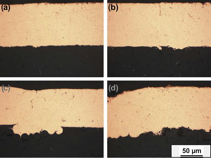 Figure 2.3. Cross-section of copper coated glass fiber reinforced epoxy composite after sandblasting with Al2O3, (a) untreated, (b) after 2 s, (c) after 4 s, and (d) after 6 s. [Adapted, by permission, from Njuhovic, E; Brau, M; Wolff-Fabris, F; Starzynski, K; Altstadt, V, Composites, B66, 443-52, 2014.]