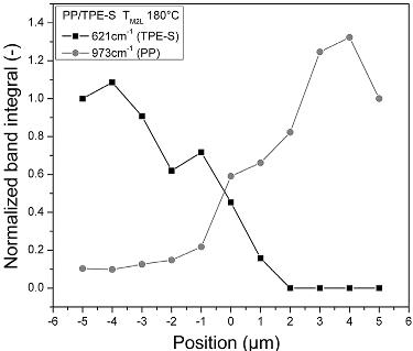 μm and +2 μm and PP is present between -1 μm and +5 μm (0 is the original interface).18 The results indicate that both materials were simultaneously detectable between -1 μm and +2 μm, meaning that the interdiffusion length was 3 μm for the material combination of PP/TPE at 180oC. For PC/TPE and PS/TPS the interdiffusion lengths were 2 μm and for PC/PMMA less than 1 μm.18 It was also noticeable that the selected temperature had important influence on the interdiffusion length.18
