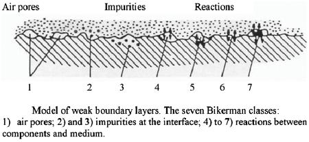 Figure 2.9 illustrates the reasons for inferior adhesion which were suggested by Bikerman long time ago.13 (Interesting to note that two of these reasons (impurities and reaction between components) were mentioned in the railway case problems.) These inhibitors of adhesion are very common in practice in the form of air pockets, dirt particles, oily surface, and reaction products (corrosion, products of oxidation, products of degradation on wood surface, skin formation, etc.).13