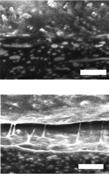 Figure 2.12. SEM micrographs of cross-sections of painted TPU/OBC blends. (upper) 25% TPU, (lower) the same blend in extension. [Adapted, by permission, from Song, J; Batra, A; Rego, JM; Macosco, CW, Prog. Org. Coat., 72, 492-7, 2011.]