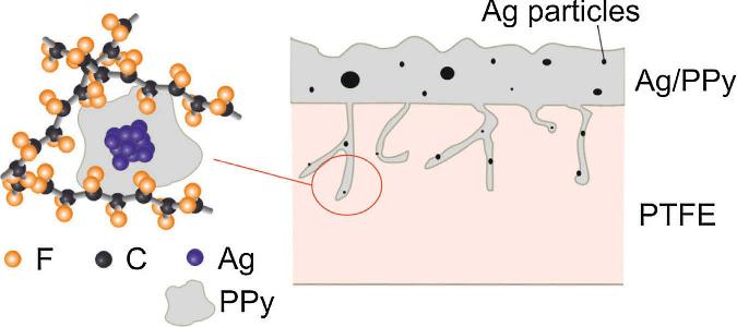 Figure 2.2. Schematic illustration of proposed interfacial structure. Absorption of Ag/PPy occurs in the PTFE by penetrating through the nano-sized pores filling the voids. [Adapted, by permission, from Horvath, B; Kawakita, J; Chikyow, T, Appl. Surf. Sci., 384, 492-6, 2016.]