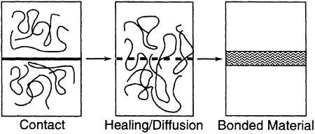 There are two important stages in this mechanism, if polymers are involved, namely diffusion and entanglement formation. Diffusion process permits chain of one material (e.g., adhesive) to penetrate the other material (e.g., adherent). In most cases, interdiffusion occurs due to the diffusion products of both materials (adherent and adhesive) to cross the boundary between them (called interface) and to form an intermediate layer which has a composition different than any of the two components and it is called interphase. Figure 2.10 illustrates these two steps leading to the formation of interface.14 From the illustration, it becomes pertinent that temperature is one of the most important variables of the process.14 It is also quite obvious that thermal welding processes are the primary examples of this type of the mechanisms of adhesion.14 Figure 2.11 shows the result of welding of polycarbonate containing glass fiber (top) and polycarbonate containing carbon black (bottom).14 Both glass fiber and carbon black are found in the interphase.14 Macromolecular structures on each side of the welding interphase penetrated to establish an entangled network.14