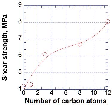 Figure 2.14. Effect of number of atoms in hydrocarbon chain of silane on the shear strength of PAA/glass adhesion. [Data from Jiang, ZX; Meng, LH; Huang, YD; Liu, L; Lu, C, Appl. Surf. Sci., 253, 4338-43, 2007.]