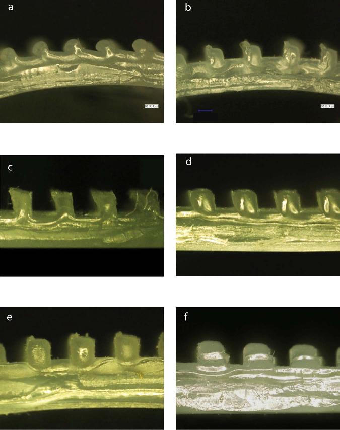 Figure 2.6. Cross-sections of PP plates after roll imprinting at 130°C with various undercut angles. a 35o, b 30o, c 25o, d 20o, e 10o, f 0o. [Adapted, by permission, from Matsuzaki, R; Tsukamoto, N; Taniguchi, J, Int. J. Adh. Adh., 68, 124-32, 2016.]