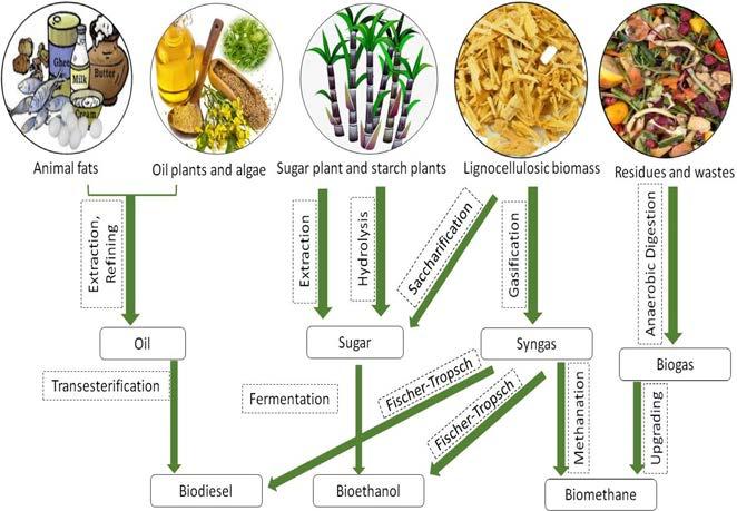 Pretreatmentmethodsvarywiththestructuralpropertiesofthefeedstock; theaimistoreduceparticlesizeandpartiallyremoverecalcitrantcomponents, whichsubsequentlyaidsinconversionproceduresthataremainlydependent onchemicalcompositions.Oilandlipidsareconvertedtobiodieselthrough transesterification.Sugar,starch,andproteinsareusedtoproducebiofueland biogasthroughfermentationandgasification,respectively.
