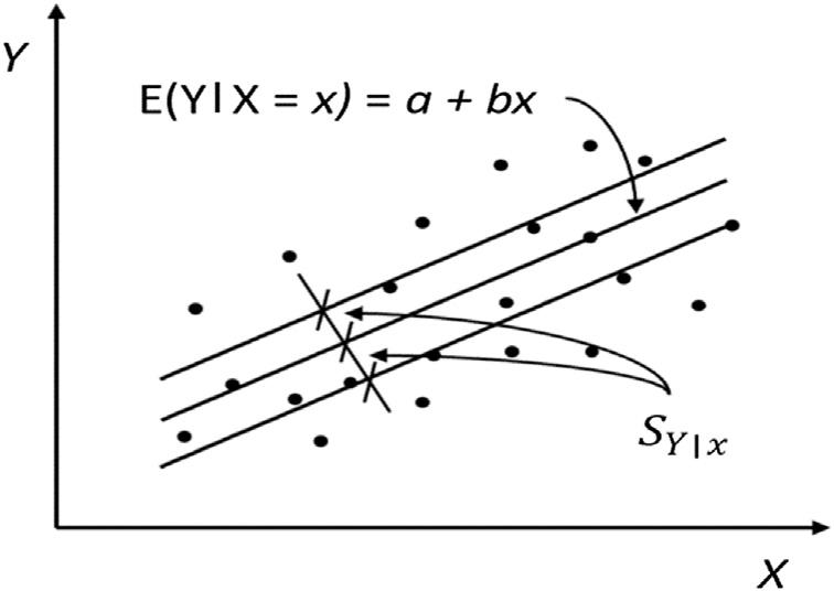 Generally,theregressioncoefficientsareestimatedusingthemethodof leastsquares.Theyareestimatedbyminimizing ε2,alsoknownastheerror sumofsquares(SSE)representingthedifferencesbetweentheobservedand predictedvaluesusingtheregressionequation. Eq.(1.30) representsthemean valueoftherelationship.Ithasalsoavariance,denotedas Var ðY jX ¼ xÞ¼ S2 Y =x ,knownastheerrormeansquareortheresidualmean square(MSE).Itcanbeestimatedas