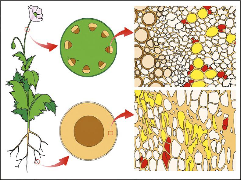 FIG. 1.4 Laticifers in poppy plant. Cross section of phloem shows pairing of laticifers (yellow), sieve elements, and companion cells (red) in aerial parts, compared with roots of poppy. (With permission from Liscombe, D., & Facchini, P. (2008). Elsevier. https://doi.org/10.1016/j.copbio.2008.02.012.)
