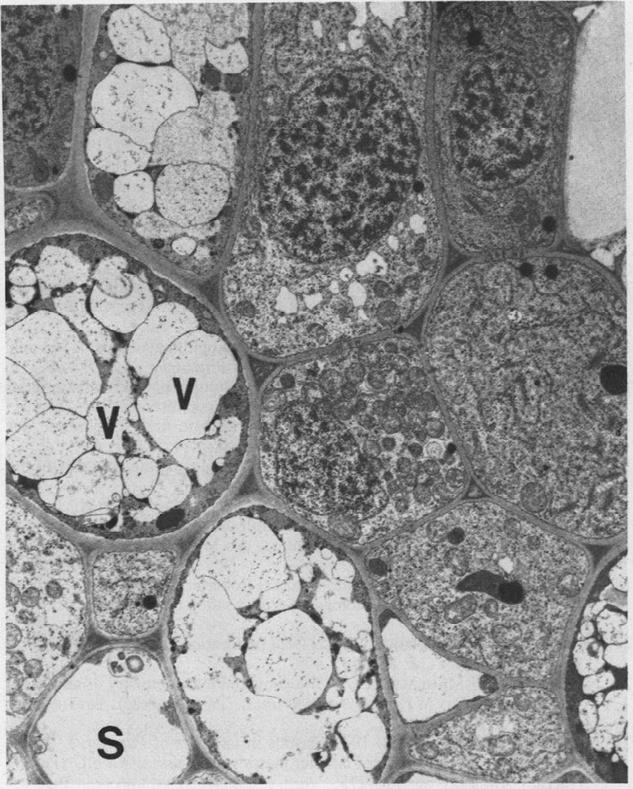 FIG. 1.6 Electron micrograph of laticifer. Alkaloids of poppy are seen suspended within vesicles (v) in the sieve (s) tubules. (With permission from Nessler, C. L., Allen, R. D., & Galewsky, S. (1985). https://doi. org/10.1104/pp.79.2.499 )