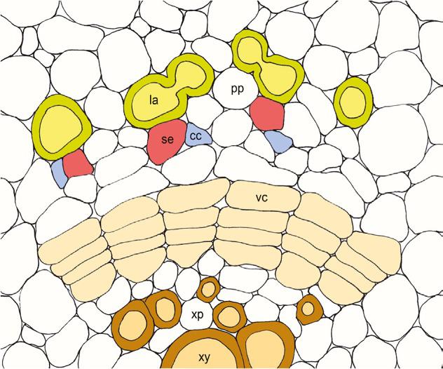 FIG. 1.5 Cross section of laticifer in poppy. Enzymes are synthesized in companion cells (cc), transported to sieve elements (se) for alkaloid synthesis and stored in laticifers (la) in phloem parenchyma (pp). Other structures shown include vascular cambium (vc) and xylem vessels (xy) in xylem parenchyma (xp). (From Lee, E., Hagel, J. M., & Facchini, P. J. (2013). https://doi.org/10.3389/fpls.2013.00182.)