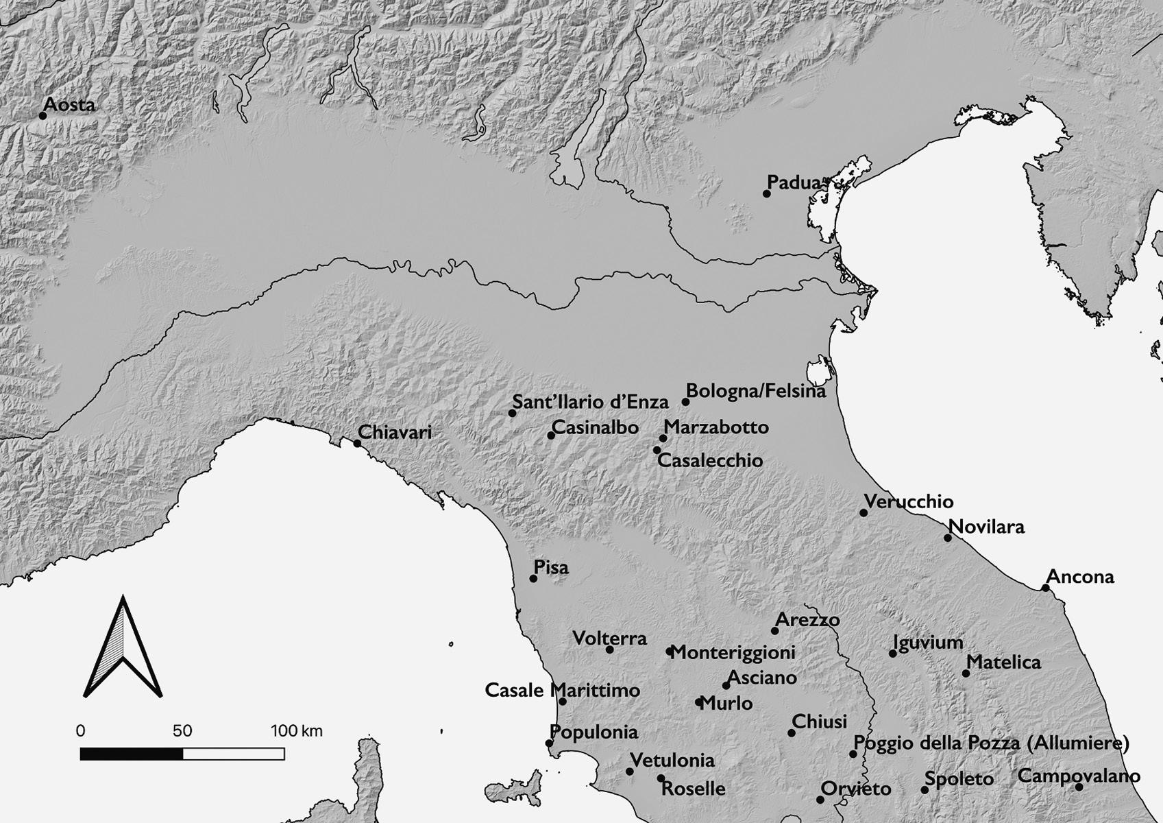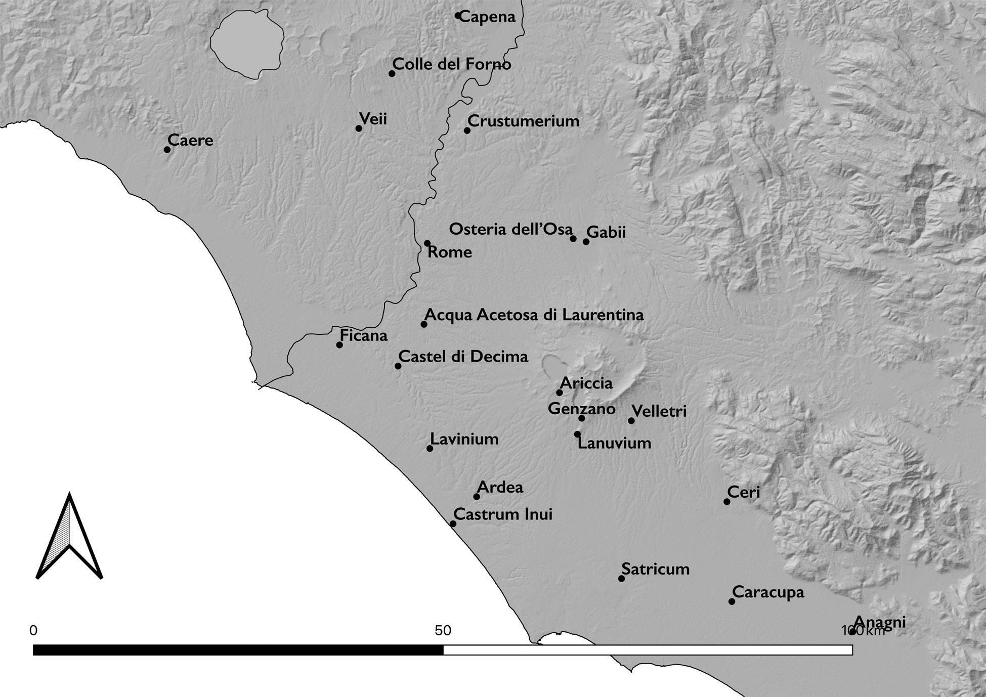 3. Central Italy and the Tiber Valley. Drawn by author with base GIS and hillshade data from EEA and place locations from Pleiades and Google Earth. viii