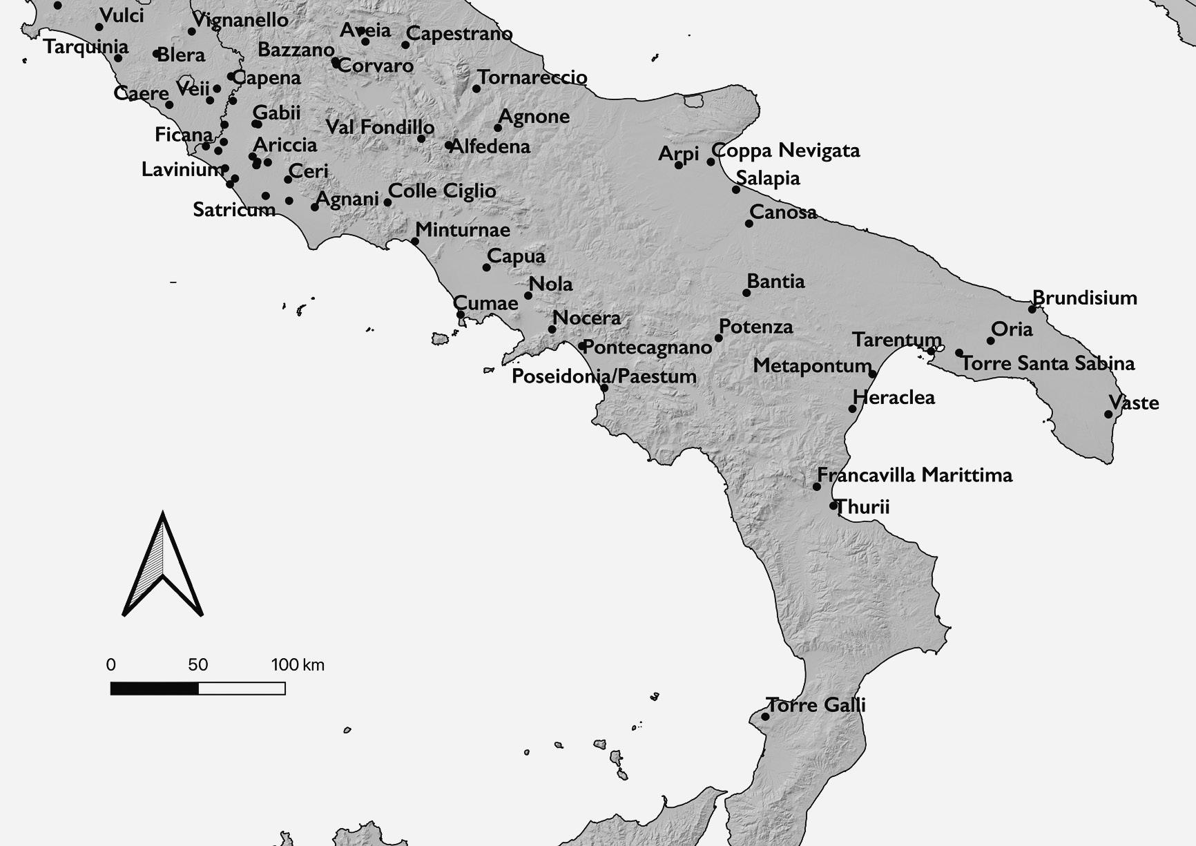 4. Southern Italy and Magna Graecia. Drawn by author with base GIS and hillshade data from EEA and place locations from Pleiades and Google Earth. ix