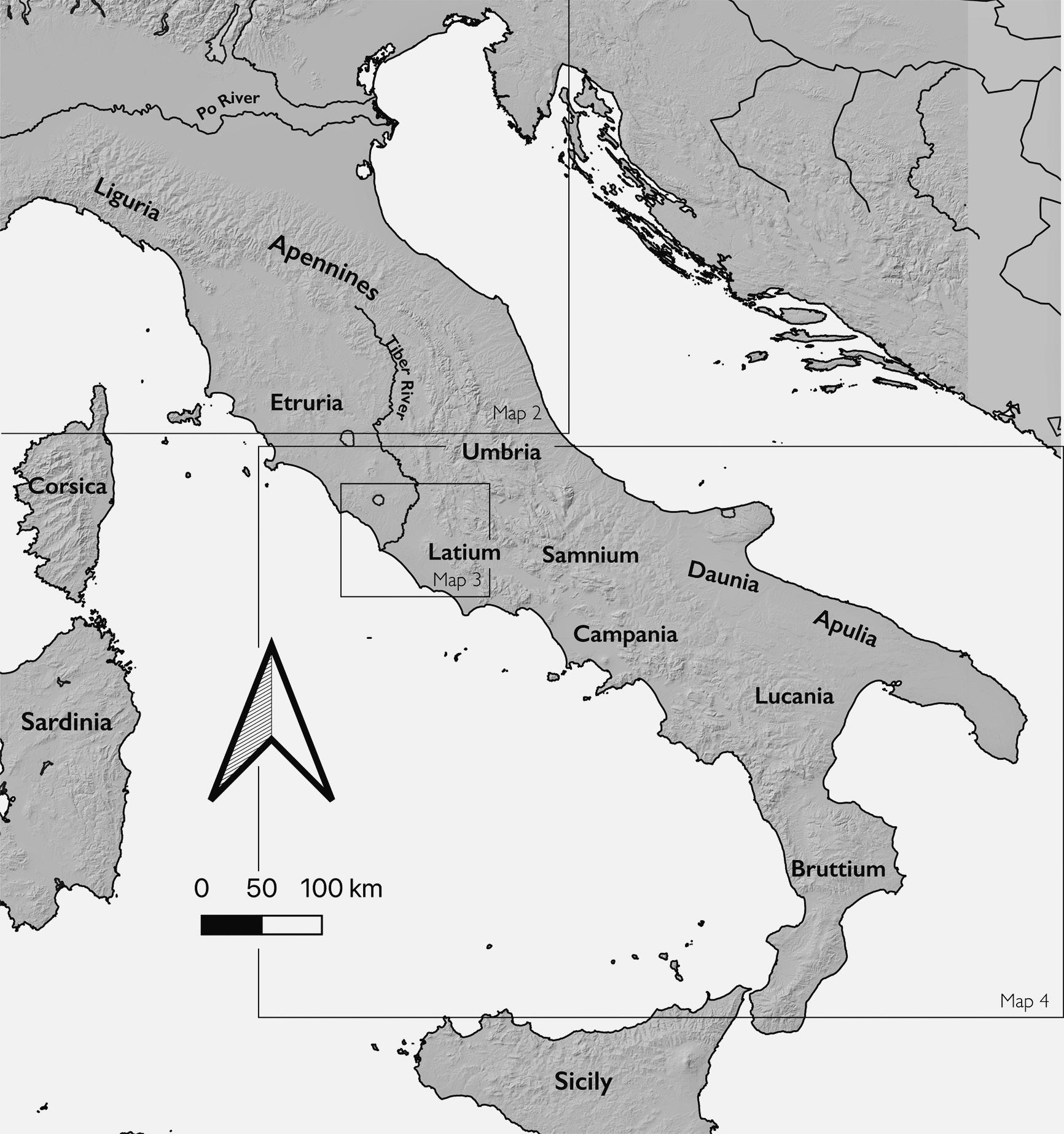 Map 1. The Italian Peninsula showing ancient regions and cultural areas. Location of Maps 2–4 indicated by boxes. Drawn by author with base GIS and hillshade data from EEA and place locations from Pleiades and Google Earth.