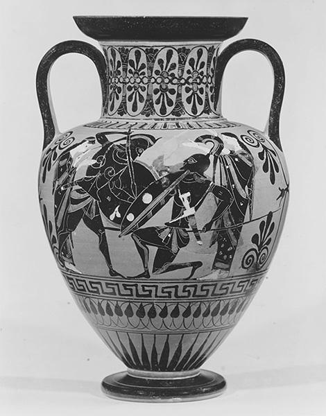 Figure 1.1. Sixth-century Attic blackfigure amphora depicting two female figures, hands upraised, who flank two duelling warriors on whom they also gaze. Attributed to the Medea Group, c. 520 BCE. Side B, The Metropolitan Museum of Art, New York; Purchase, Christos G. Bastis Gift, 1961, 61.11.16. www.metmuseum.org.