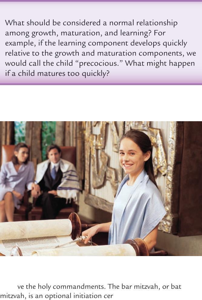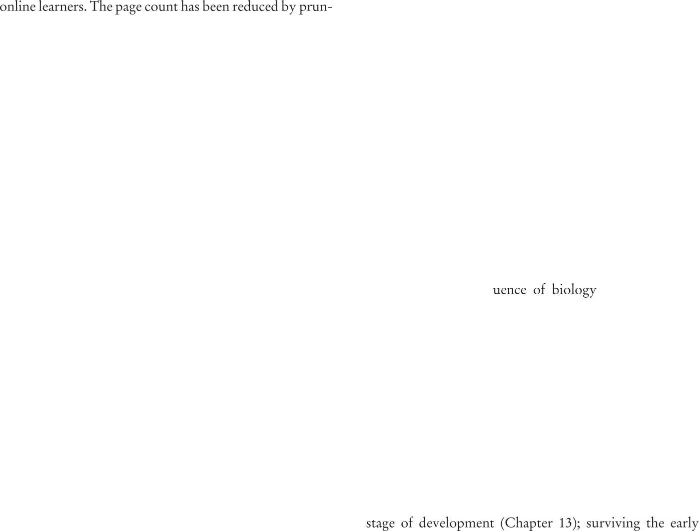 Also, unlike many competing textbooks, the tenth edition of Human Development is not cluttered with visual features that undermine the reader’s ability to distinguish the most important information, and the key relationships among ideas, from everything else on the page. Too often textbook pages are filled with large, distracting figures, multiple colors, and numerous photos that overwhelm the reader’s short-term memory and create cognitive overload. Although they may look appealing in marketing brochures, such graphic devices as large photos, boxed inserts, multiple highlighting techniques, several competing colors, many key terms defined in the margins, and other misplaced pedagogical devices confuse the reader and make it difficult to focus on the