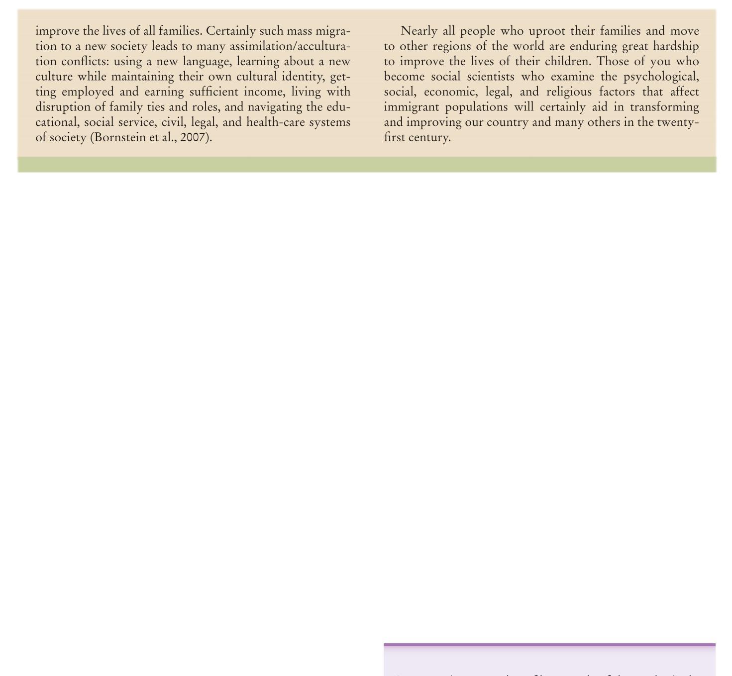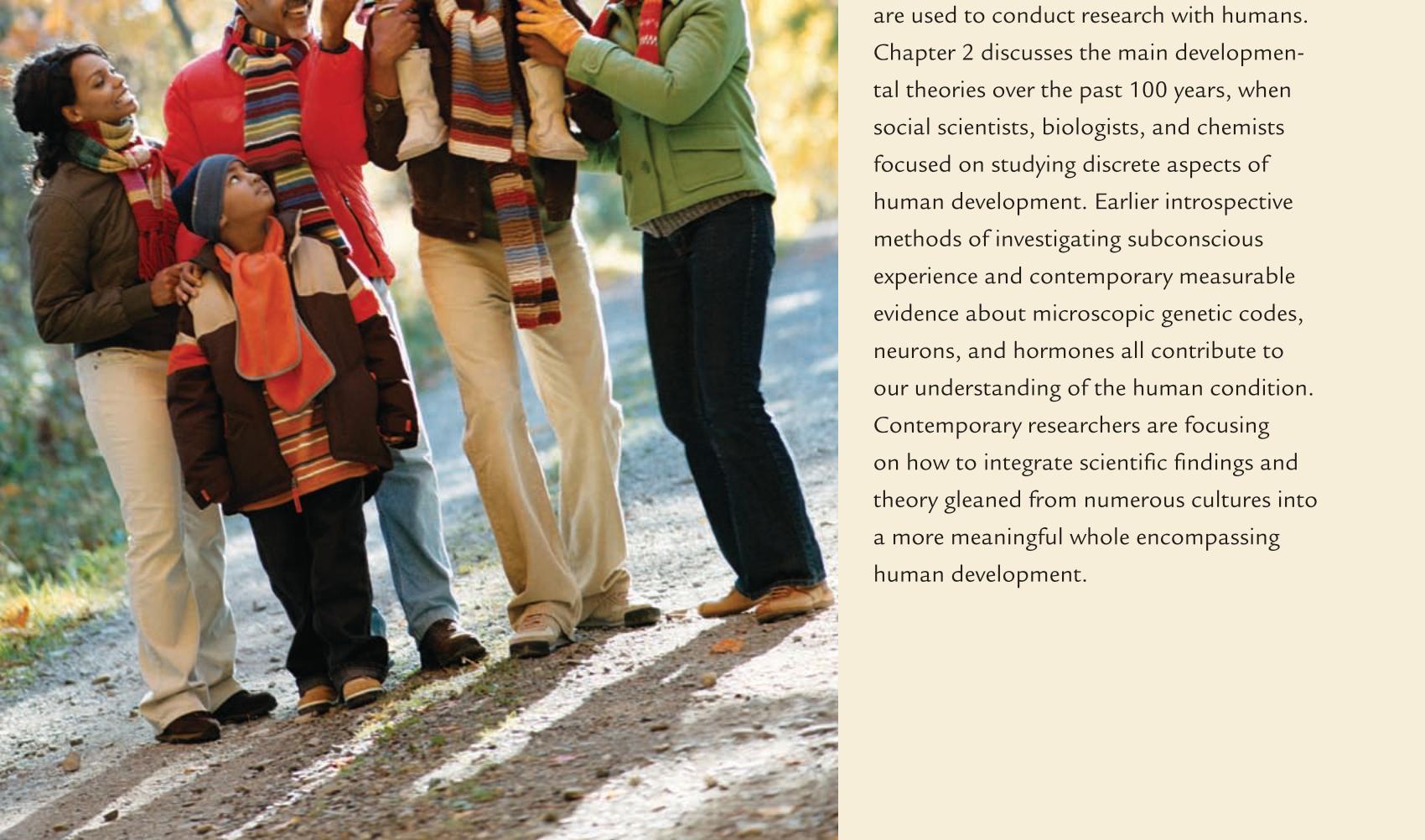 Calling attention to emerging issues in human development is a crucial component of our task as teachers and authors. Specific examples of this approach include research on the complex effects of immigration in the United States (Chapter 1); the range of developmental theories across various domains of the life course (Chapter 2); the Human Genome Project and the trend of childbirth in midlife (Chapter 3); childbirth in America (Chapter 4); boosting babies’ brain power (Chapter 5); the rising incidence of autism (Chapter 6); health beliefs and practices across cultures, including the use of video games with health benefits (Chapter 7); preparing children from widely diverse backgrounds for kindergarten (Chapter 8); educating students with differing abilities and cultural backgrounds, genius and giftedness, and for children of veterans (Chapter 10); the rise in cos-