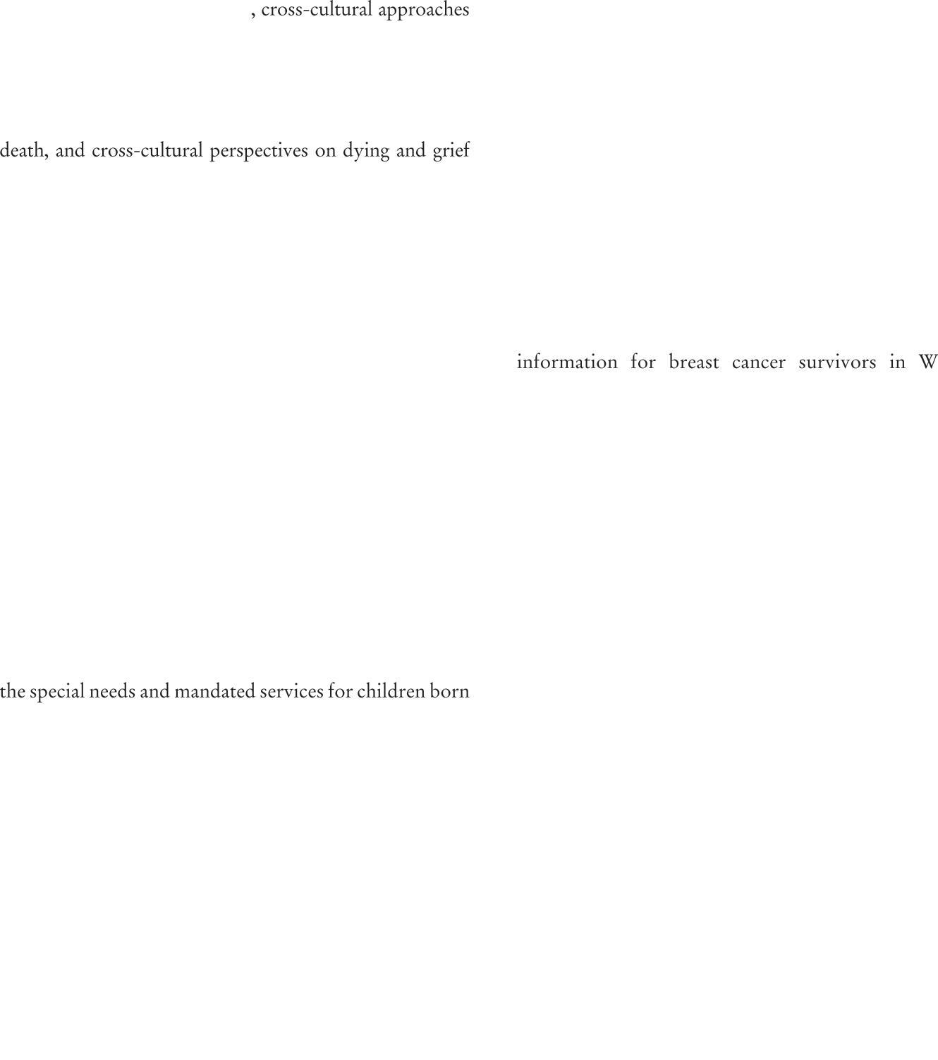 middle-aged and older adults, the special needs of lesbian and gay elderly, theories of adjustment to physical decline and loss of social relationships, sexuality in late adulthood, adult day care and various institutional arrangements, psychosocial changes and aging (including the use of online social networking), the role of faith for many who are aging, the psychosocial needs of widows and widowers, and planning for one’s own end-of-life care and needs. Many of these issues on aging are presented from cross-cultural perspectives. At the suggestion of reviewers, we added a new section on various views of near-death experiences and an afterlife.