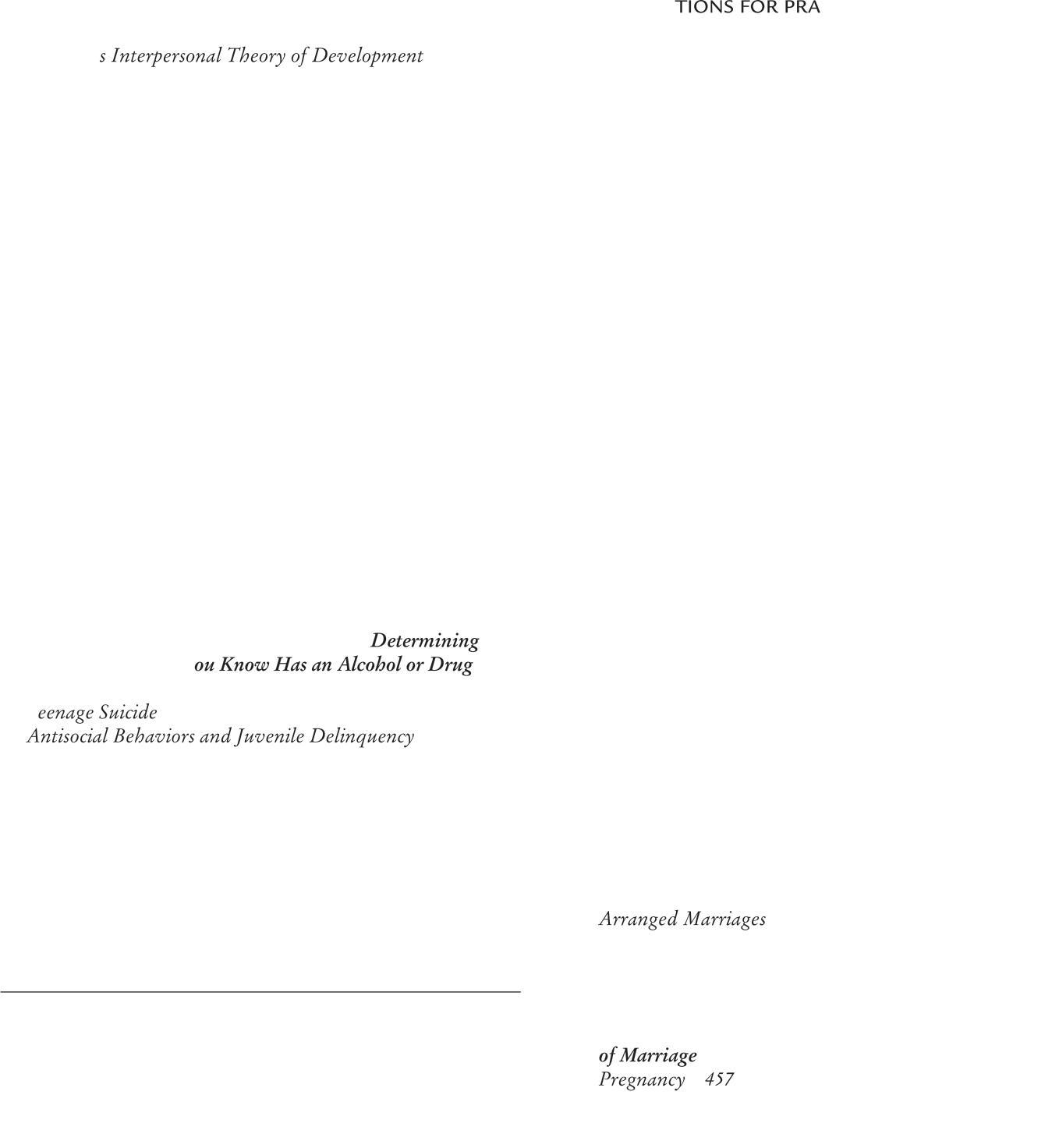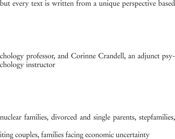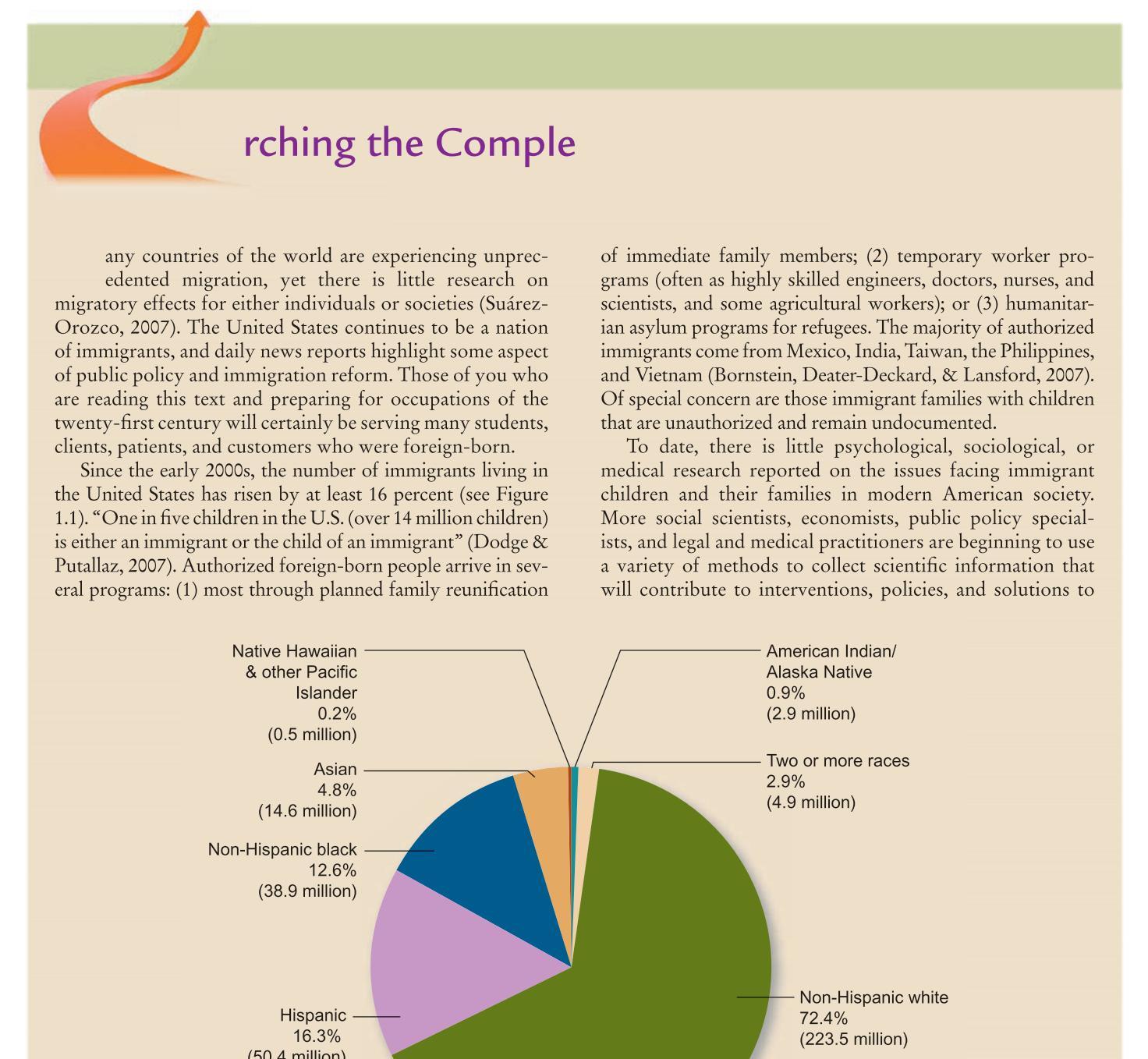 The challenging, real-life topics we discuss include research on the complex effects of immigration (Chapter 1); the emergence of the “young-old” and the “oldest-old” (Chapter 2); the newest assisted reproductive technologies, updated research on the Human Genome Project, and stem-cell research and human cloning (Chapter 3); the effects of poverty on preterm births and infancy by race-ethnicity, as well as various practices in labor and delivery (Chapter 4); differing theories of language acquisition, bilingualism, and effects of infant media viewing on cognitive and language outcomes (Chapter 5); current research on gay and lesbian parenting, child care across cultures, rising rates of autism, the effects of child maltreatment, and parenting practices that promote child well-being (Chapter 6); demographic trends and implications for children’s health, (Chapter 7); health beliefs and practices across cultures; Muslim American cultural expectations; the infl , brain, and hormones on gender behaviors; and parenting practices (Chapter 8); the latest statistics on child obesity and its implications, current research on ADHD and learning disabilities, and why Asian children strive for excellence (Chapter 9); children of “choice mothers” (Chapter 10); adolescent health-risk behaviors, including risk for HIV/ AIDS; an assessment of how U.S. students compare academically with other students around the globe; and new research on the effects of father absence from the home (Chapter 11); the racial-ethnic socialization of teens, and statistics and outcomes of higher teen school dropout rates (Chapter 12); traits of the Millennial Generation, sexual health issues, and emerging adulthood as a new