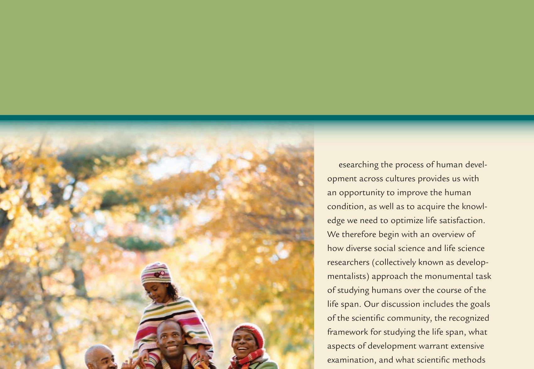 TO PROVIDE YOU WITH THE MOST recent research findings in human development over the past three years, we have done an exhaustive search of the research literature across many disciplines to provide the most up-to-date, organized, and easy-to-read account of the overall organization and sequence of development across the life span. As with the past nine editions, we strive to continue our legacy as McGraw-Hill’s premier multidisciplinary human development textbook by offering our readers a wide array of contexts in which to make sense of the complex nature of the human condition. Changing demographics, new biosocial technologies, increased plasticity within and between stages of development, the implications of fertility decline in Western societies, the lengthening of the life span, and the globalization of cultures require today’s students to understand human development through an increasingly multicultural and multidisciplinary lens. In addition, the recent serious challenges posed by global economic decline, geopolitical unrest, and massive natural disasters in various countries contribute to our understanding of the resilience of the human condition.
