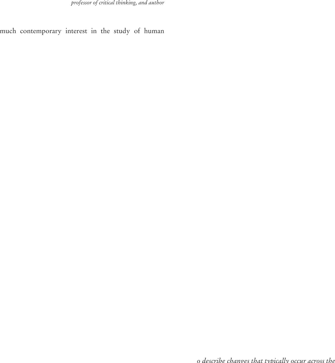 As we have said, a course on human development should do more than lay out for students a body of scientific findings. Rote memorization of definitions and facts does not do justice to the dynamic nature of this subject matter. We must encourage students to think critically and creatively about their own development and how it is shaped by the world around them. This text will provide students with a deeper understanding of the human experience and the variety of factors that directly or indirectly mold their life course.
