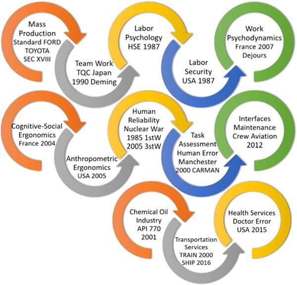Intermsofcountriesdealingwiththeseissues,theUnitedKingdomshouldberememberedwithitsmassproduction,theUnitedStateswithFordismandJapanwithToyotismandTotalqualitycontrol.IntheSocialarea,thepsychologyofAmerican-EnglishworkandthepsychodynamicsofworkinFrance.Inergonomics,theFrenchcognitive-social discussionandtheAmericanobjective-anthropometricalergonomicsforInterfaceandcontrolroomprojects.Finally, thesubjectofhumanreliabilityledbythenuclearenergyareaattheUnitedNations,representedbytheCommitteeon theSafetyofNuclearInstallations(CSNI)andtheanalysisofthetaskinthechemical-oilindustryinEngland (Manchester).