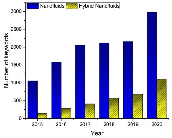 Fig.1.4 Numberofkeywordsusedyearlyformonoandhybridnanofluids.Thedata istakenfromElsevier.
