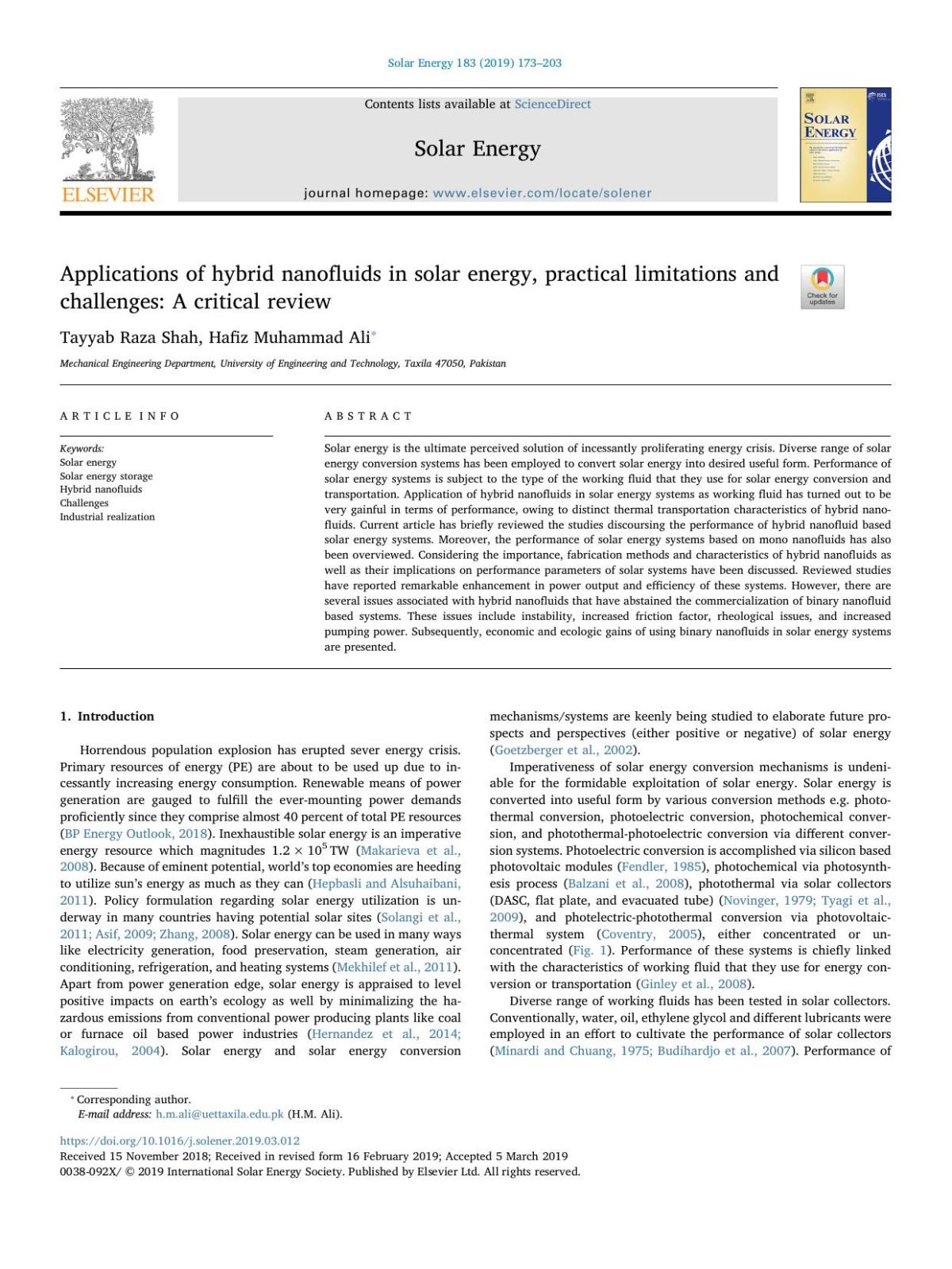 Applications of hybrid nanofluids in solar energy, practical limitations and challenges_ A critical review Tayyab Raza Shah & Hafiz Muhammad Ali