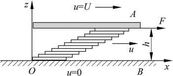 Newtonproposedamodelforviscousfluids,inwhichheproposedthattheviscousfluidmotionrelativelyslidesinmanyverythinlayers,asshownin Fig.1.1.In thefigure,aflatplatewithanarea A onthetopofthefluidmovesatavelocity U undertheactionoftheforce F.Acrossthefilmthickness h,anothersurfaceisfixedat thebottomofthefluid.Thetwosurfacesareparallel.Duetotheviscosityofthefluid, internalfrictionalactionwillexistbetweeneachslidinglayer.Motionwillbetransmitted totheadjacentlayersthroughthisaction,whichcausesthefastermovinglayertodecelerate,andtheslowermovinglayertoaccelerate.Aflowvelocitydistributioniseventuallyformed.IfthefluidisNewtonian,theflowvelocity u willchangeinastraightline asshowninthefigure.