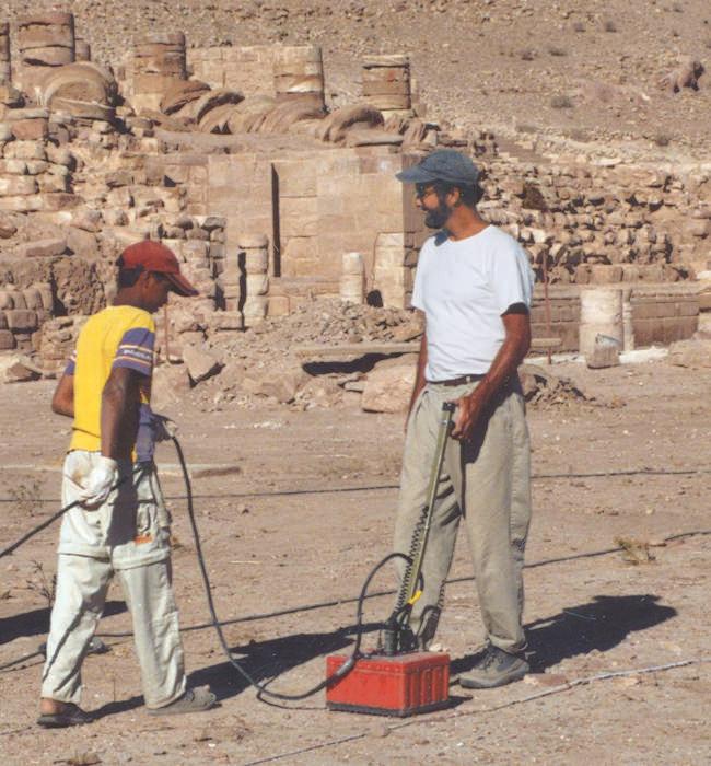 1.9 Georadar in action. (a) Lawrence Conyers and assistant pulling the ground-penetrating radar (GPR) across an open area at Petra. (b) Schematic drawing of the instrument in use, emitting microwaves and measuring the response with an antenna. (c) Acomputergenerated display of the results of the magnetometer survey showing the outline of a rectangular structure buried in the middle of the open area. Test pits at this location revealed that stone walls were being recorded by the GPR.