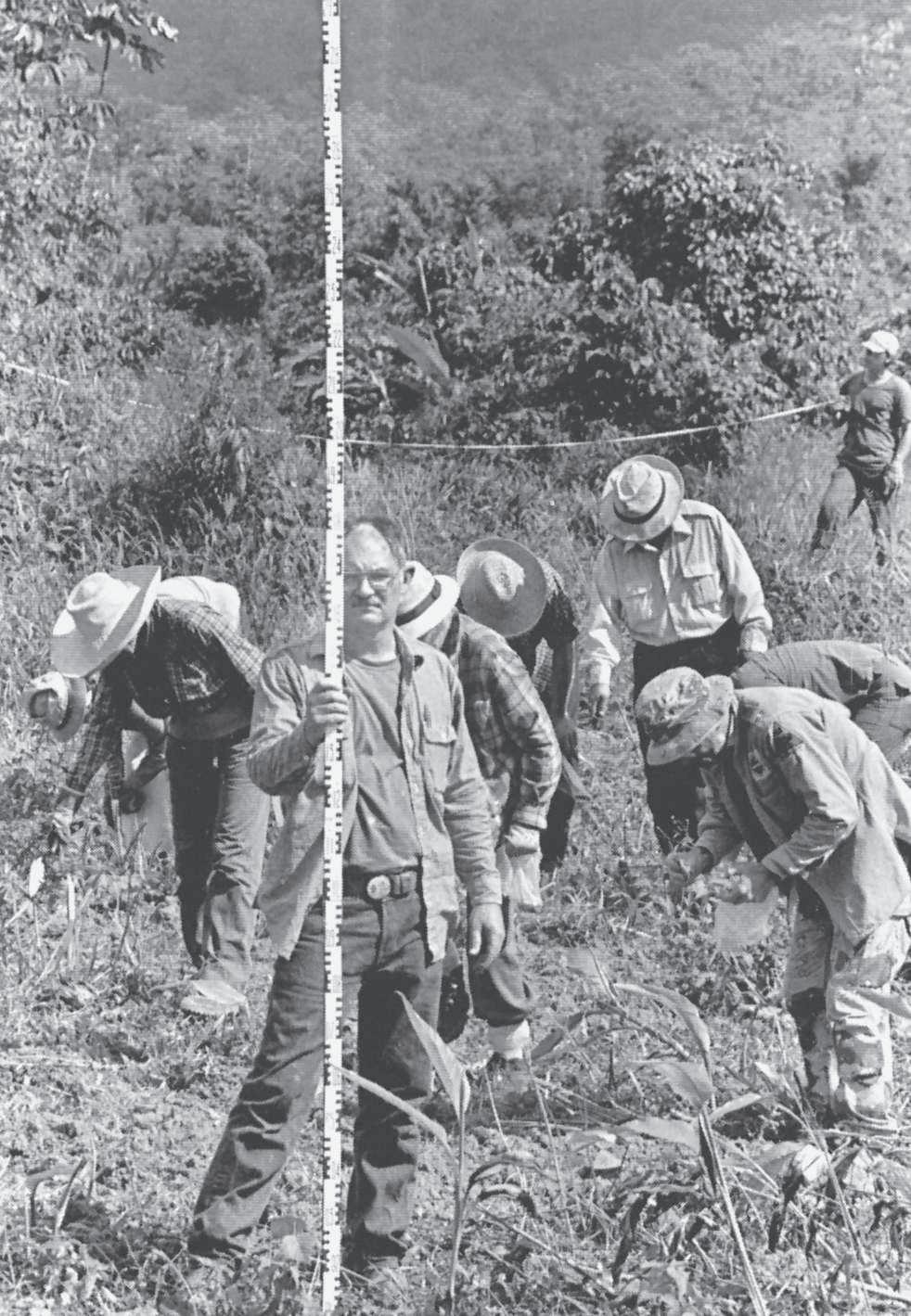Figure 1.8 Working a site. Intensive surface collections are made to pick up artifacts that may help date the site. One archaeologist holds a stadia rod used to measure the elevation.