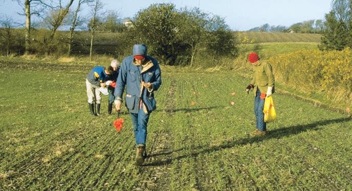 Figure 1.7 Field survey in Denmark. The small red flags mark the location of finds on the surface of the plowed field. This site was from the Neolithic period.
